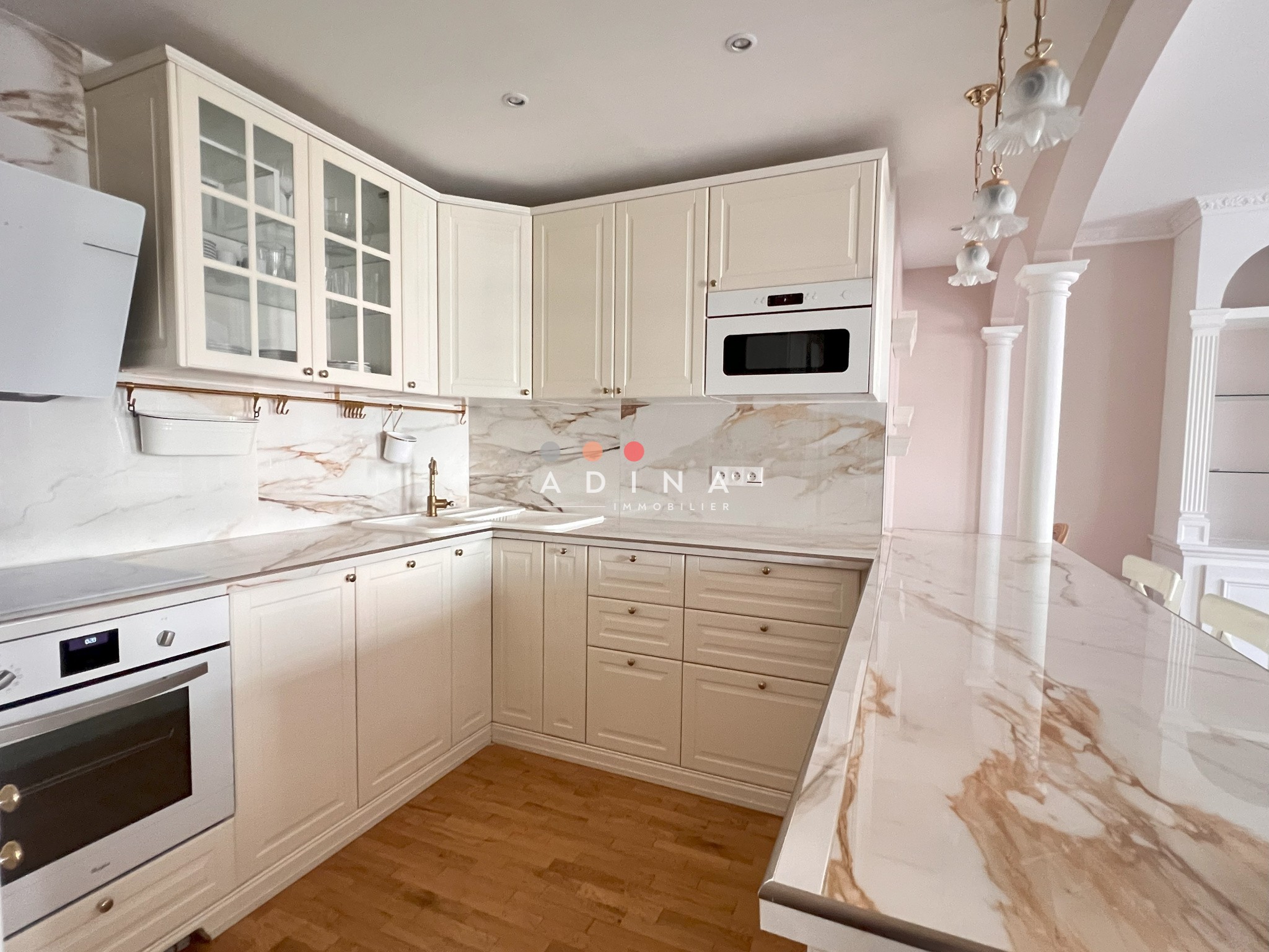 Il se compose d’une entrée, d’un séjour lumineux avec cuisine américaine entièrement équipée (réfrigérateur, four, lave-vaisselle, four micro-ondes, hotte), de deux chambres, d’une salle de bains ainsi que de WC indépendants.